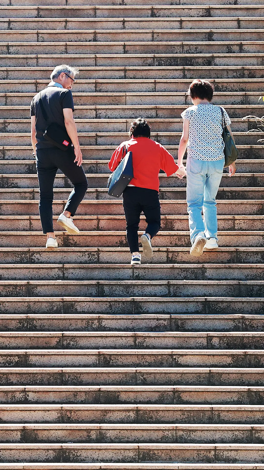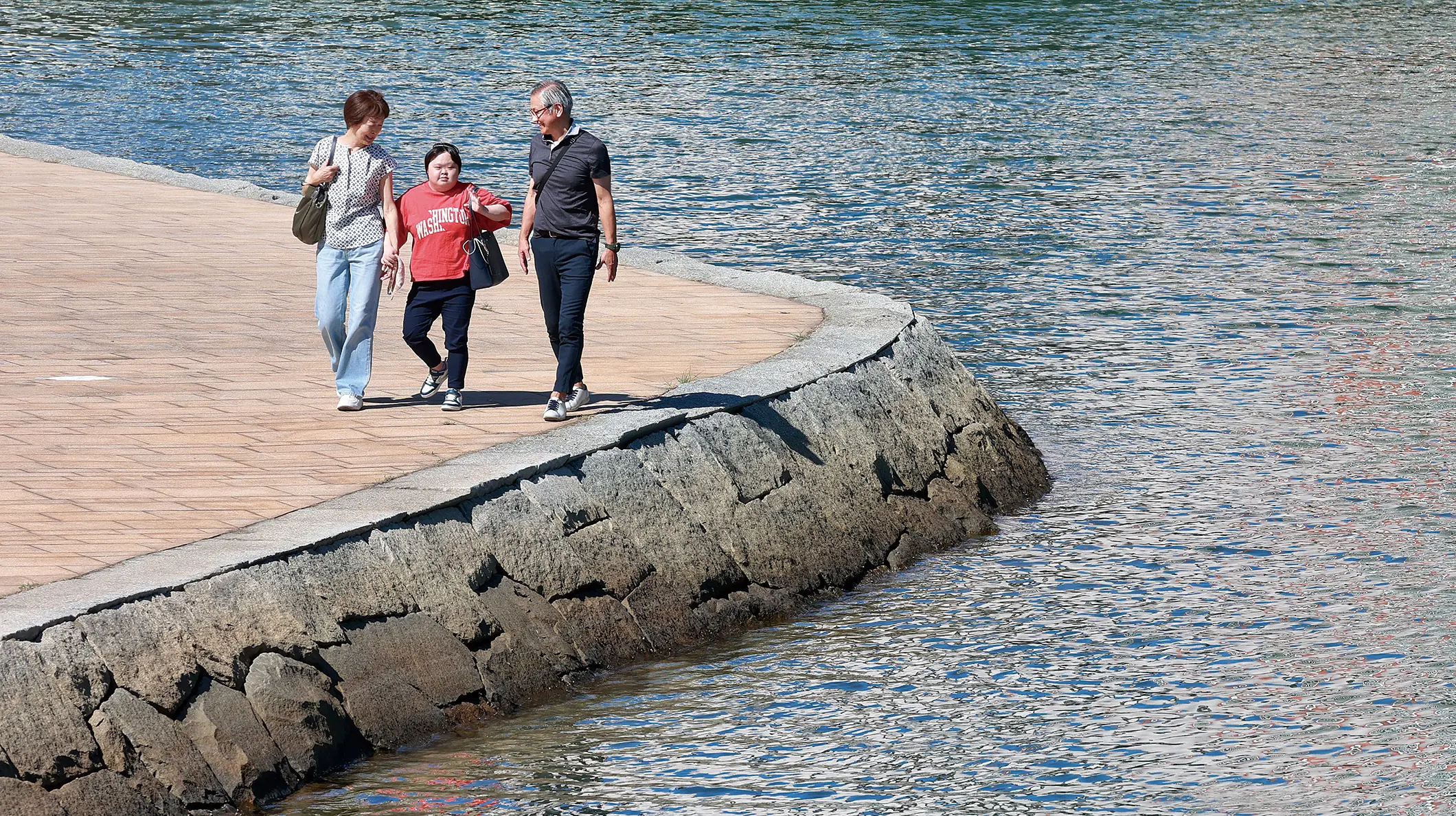 自宅に近い小倉城の周辺を散策するのが一家の楽しみ。寄り添って歩く3人の周りに「笑顔の時間」が流れています。