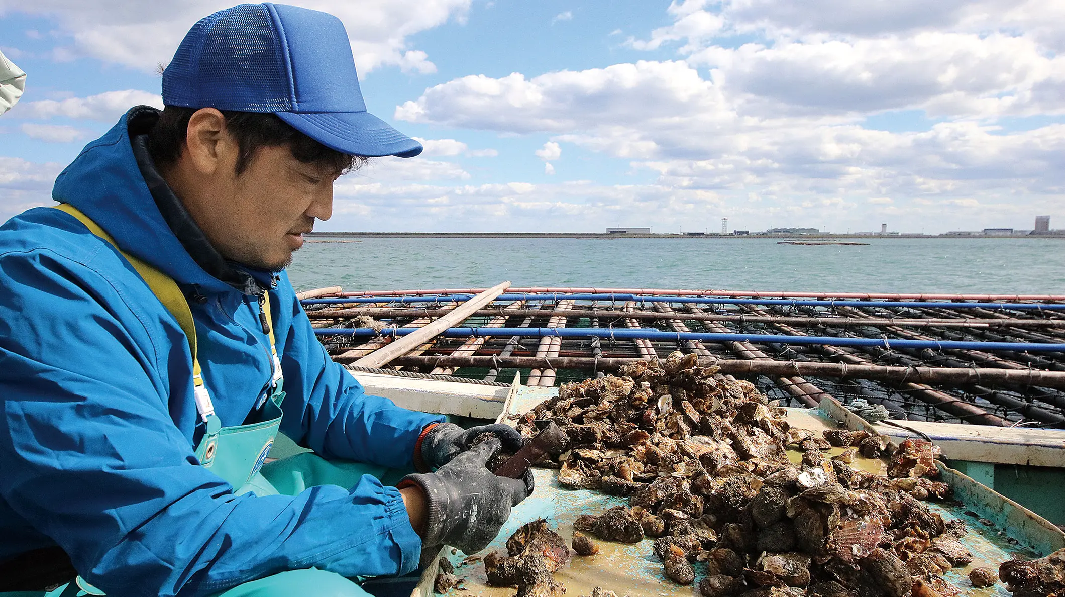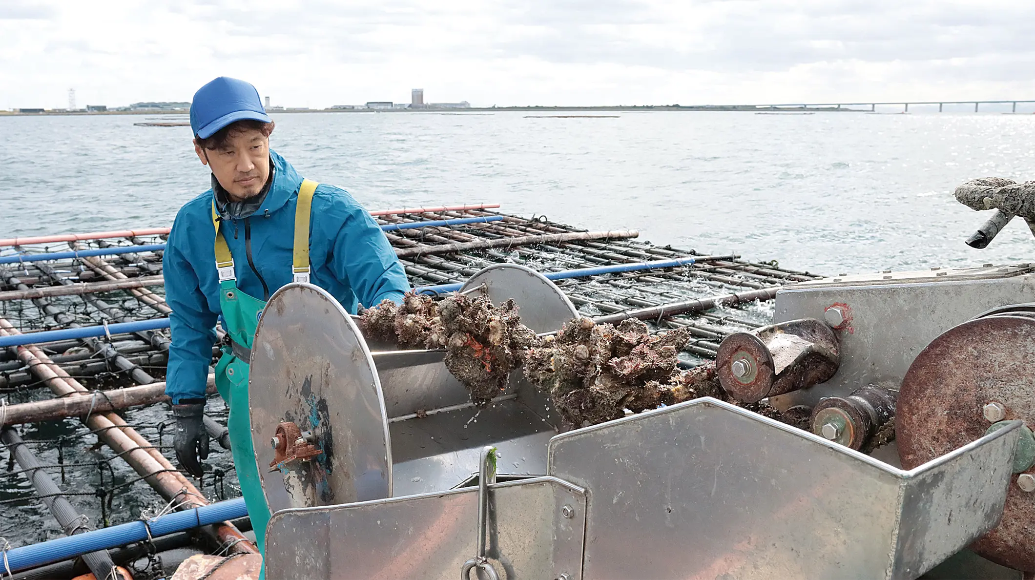北九州市の東部に広がる曽根干潟。その沖合にはカキの養殖イカダが浮かびます。豊前海北部漁業協同組合恒見支所に所属する漁師・江口英利(えぐちひでとし)さんは、父親が始めたカキ養殖を受け継ぎました。