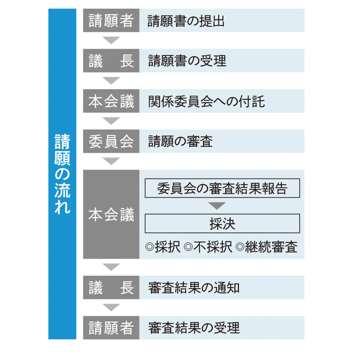 請願とは、県議会に対し、住民の方々が要望や意見を述べる制度で、県議会議員の紹介を必要とします。請願は、委員会での審査後、本会議において採決され、採択、不採択、あるいは継続審査の決定を行います。なお、採択された請願は必要に応じて、国などに意見書を提出したり、県に対して、その処理経過および結果の報告を求めたりするなど、要望や意見の実現に向けて処理します。