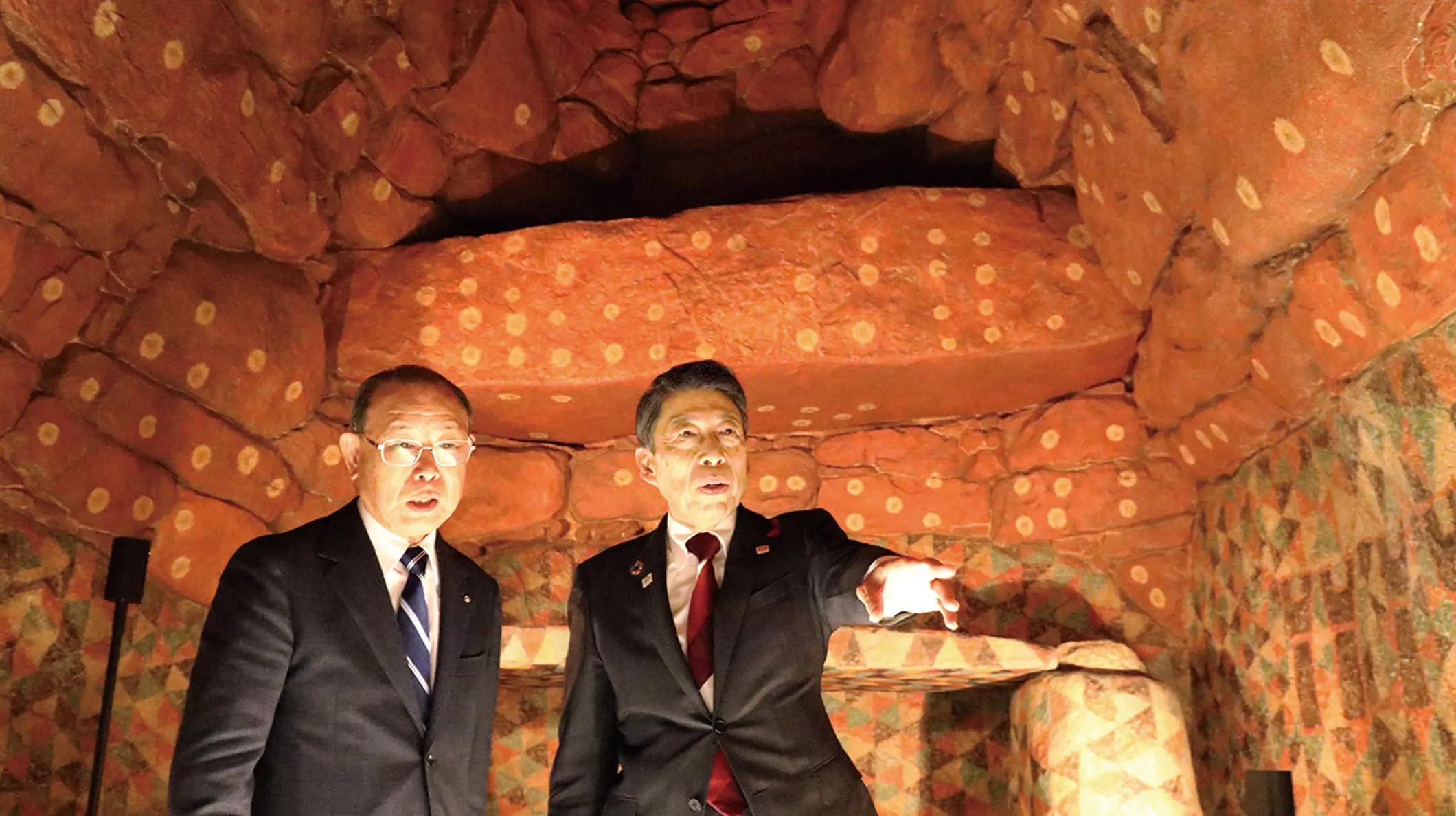 6世紀の前方後円墳で、1952(昭和27)年に国特別史跡に指定。国内最多の6 色で盾や三角文などの文様を描いた豪華絢爛な装飾壁画で知られる。隣接する王塚装飾古墳館は、精巧な構造を再現した石室のレプリカなどを展示している。(2025 年11 月現在休館中。再開時期はホームページなどで告知予定)