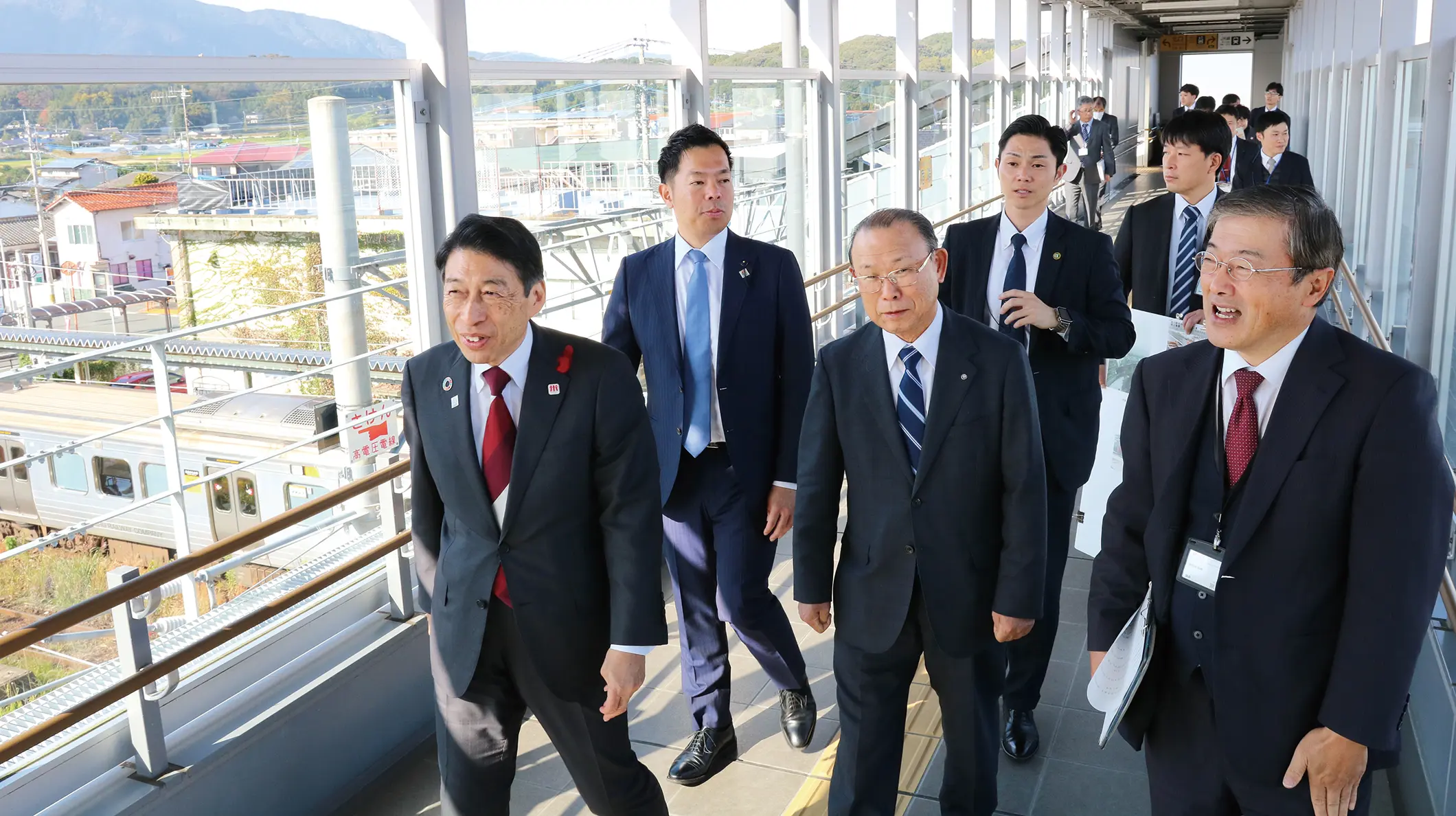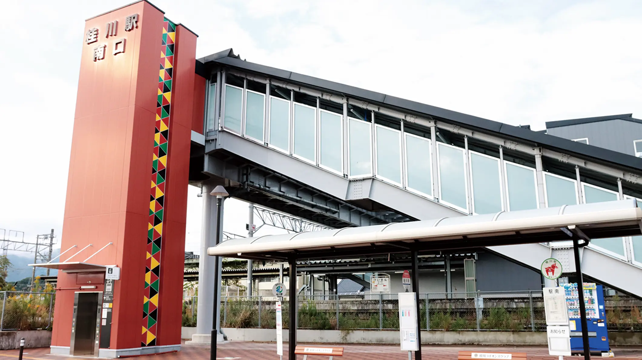 駅周辺の利便性向上とにぎわい創出のため、2021年に新しい駅舎と南北を結ぶ約40メートルの自由通路が完成。駅1階には観光案内・待合スペース「keisen まちプラザ」があり、駅の外壁には古墳壁画の文様をイメージした装飾が施されている。隣接地には町営駐車場も整備されている。