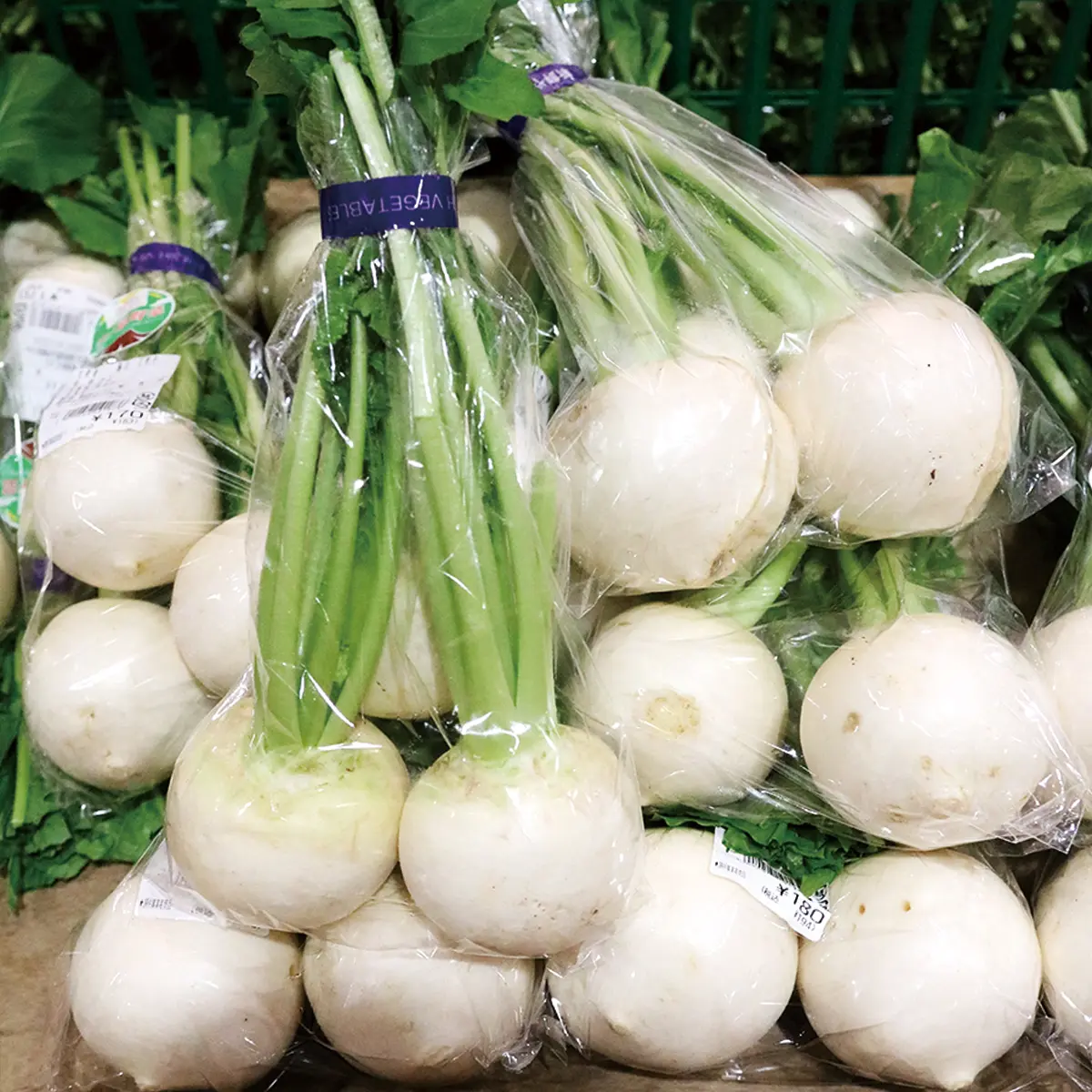 冬の物産館には、ダイコンやハクサイ、カブ、ホウレンソウなどの産品が並びます。井上さんによると、赤土で育った根菜類は特に甘くなり、山の中腹で育った野菜は寒暖差の影響で張りと鮮やかさが増すといいます。