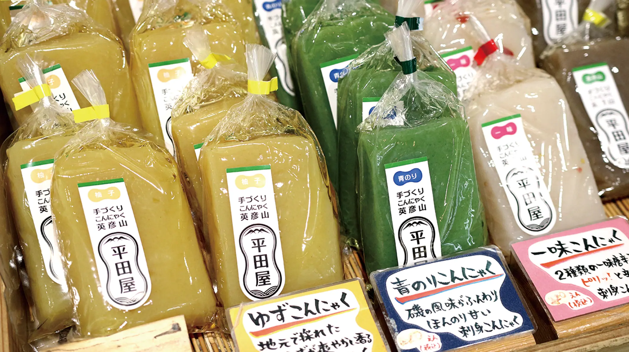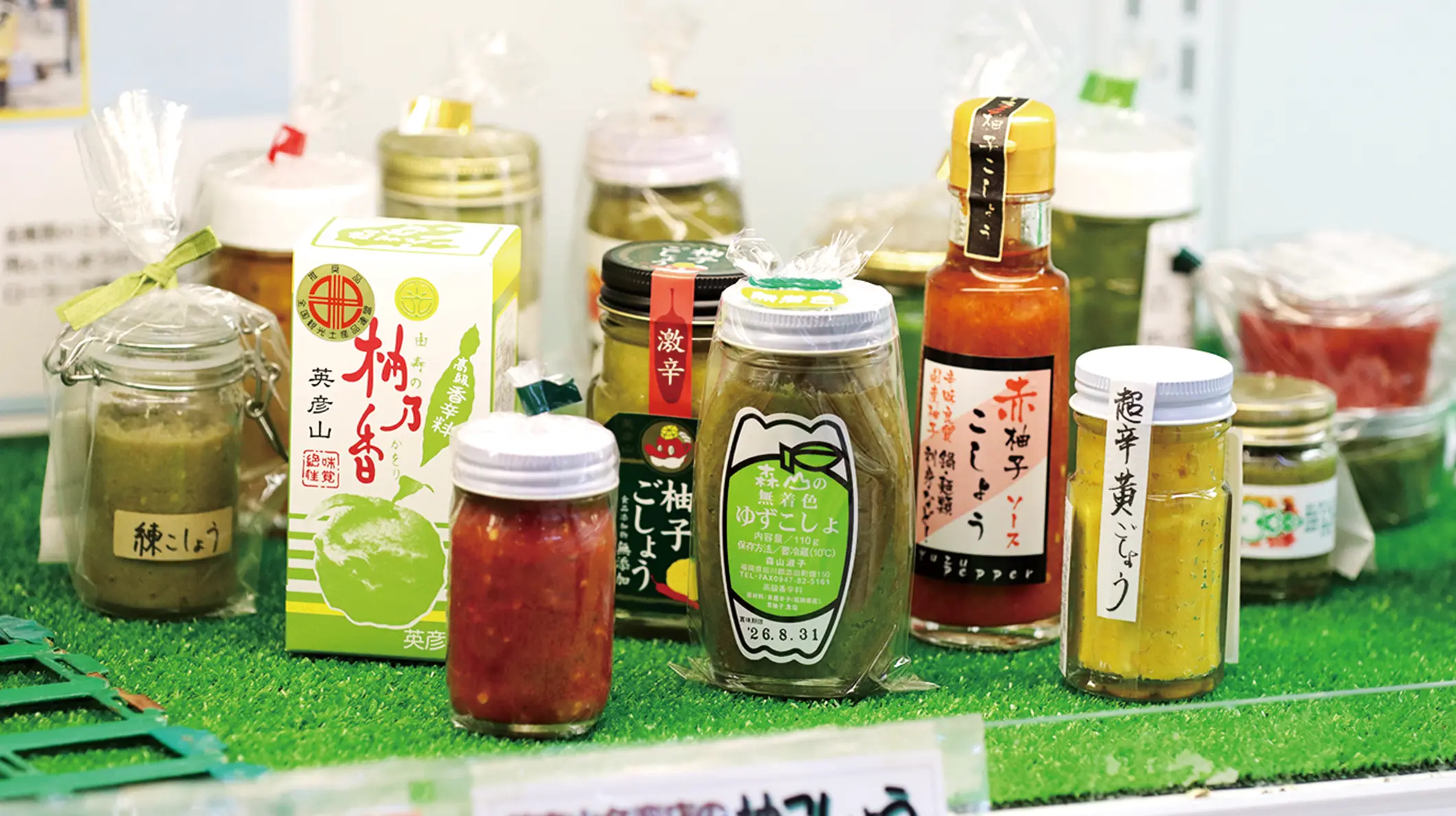 添田町産の食材を用いた総菜や弁当、加工品を扱うコーナーも人気です。売れ筋は、季節を問わずに「柚子胡椒(ゆずこしょう)」。辛いもの好きに人気のハバネロやブートジョロキアを使った商品をはじめ、減塩タイプなどさまざまそろえています。10人以上が出品しており、好みの味に出会えるはず。このほか、英彦山の天然水を利用した手づくりコンニャク、風味豊かな味噌(みそ)や地酒なども並んでいます。