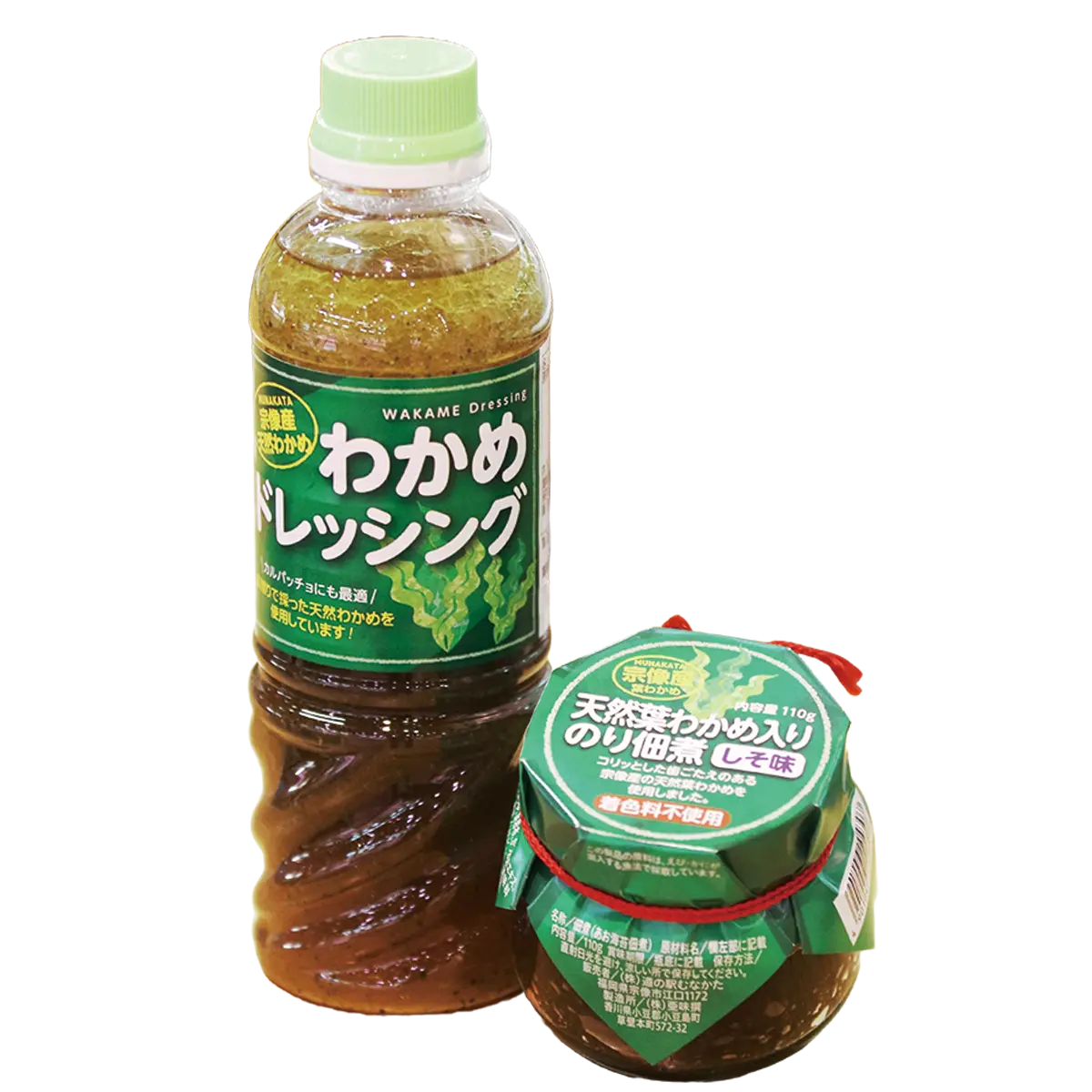 豊かな香りとやわらかさが特長の、宗像産天然ワカメをふんだんに使用した商品。ドレッシングは磯の香りを感じる醤油(しょうゆ)ベースで、カルパッチョなど魚料理との相性も抜群です。