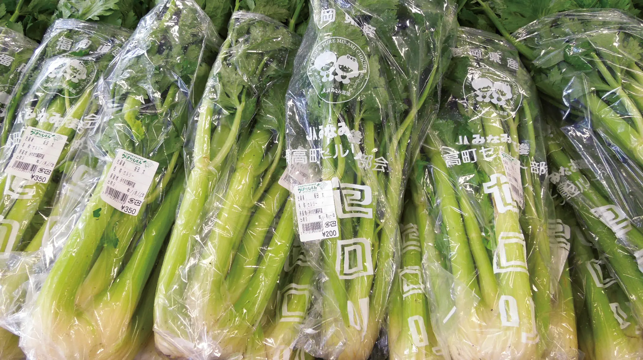 「セロリは全国的に有名で、西日本でトップの生産量です」と、駅長の久冨慎太郎(ひさとみしんたろう)さん。11月頃から店頭に出始め、収穫は6月頃まで続きます。シャキシャキ食感とみずみずしさが特徴で、直売所では一株丸ごと売られています。