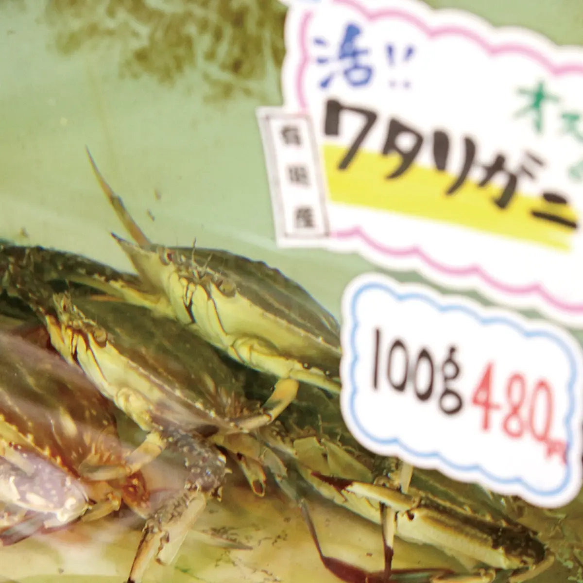 直売所には鮮魚店も入居。濃厚な味のワタリガニや、寒い時期にはイイダコやハゼ、有明海に生息するクツゾコ(シタビラメ) などが入荷することも。淡泊で身がしっかりしているクツゾコは煮付けにすると絶品で、地域自慢の郷土料理です。