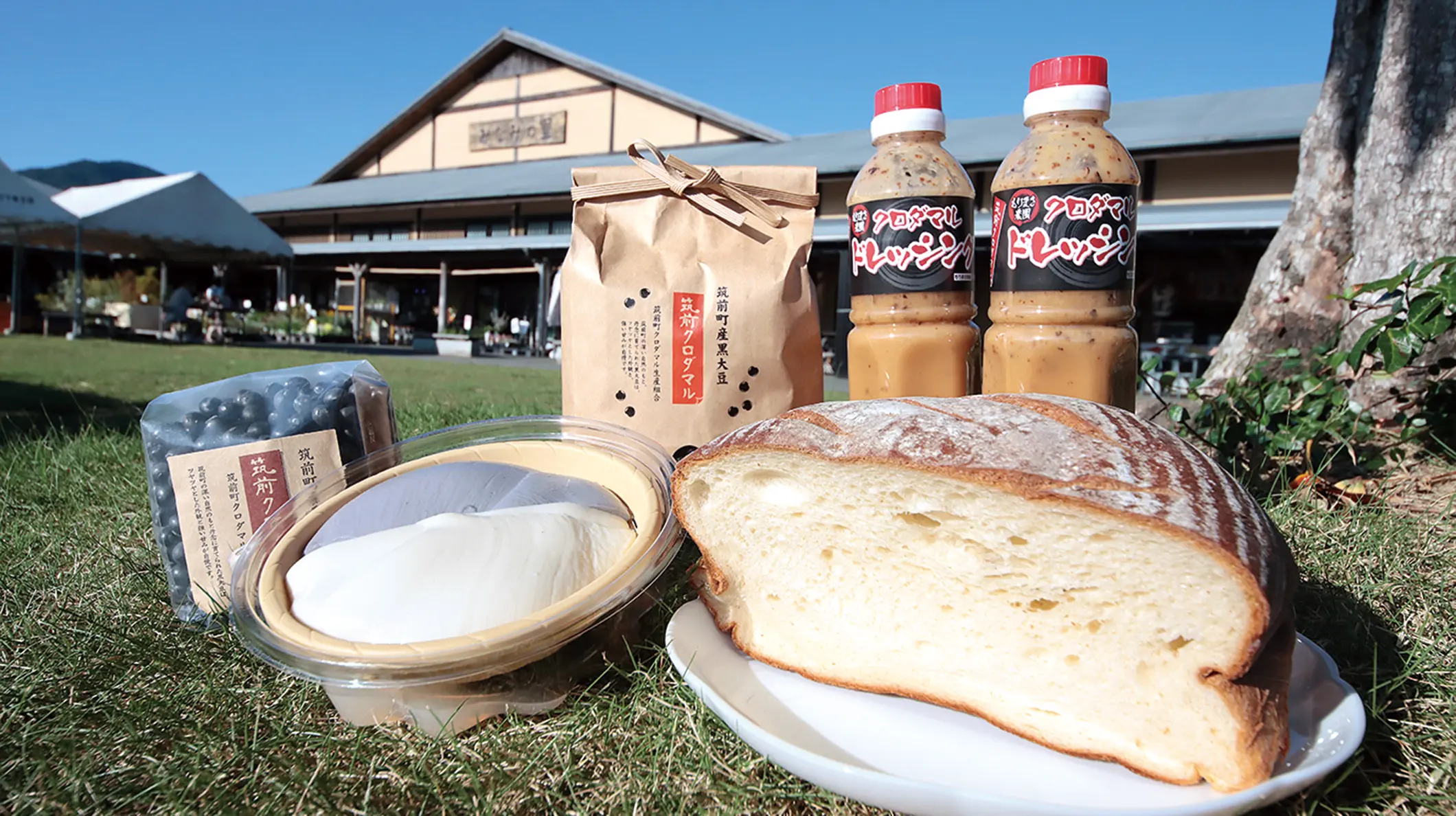 一角には町がブランド化に取り組む黒大豆「筑前クロダマル」を扱うコーナーがあり、煎(い)り豆やきな粉、ドレッシングなどがそろいます。手作り加工品もあり、クロダマルの豆腐や煮豆のほか、筑前煮やぬか漬けなど、懐かしい味が楽しめます。