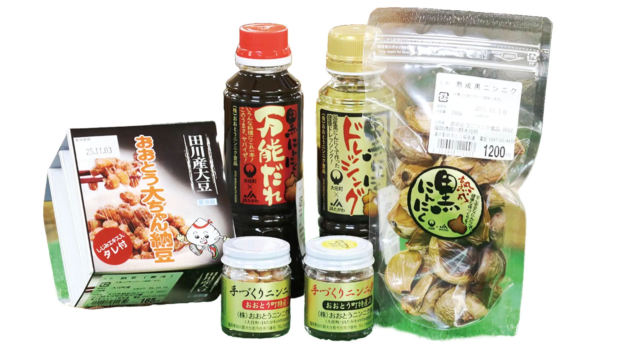 直売所には、納豆をはじめ地元産の素材を使った加工品がそろいます。熟成黒ニンニクのドレッシングや、地元で健康に良いと伝わる「ニンニク球」といった特産品を販売しています。