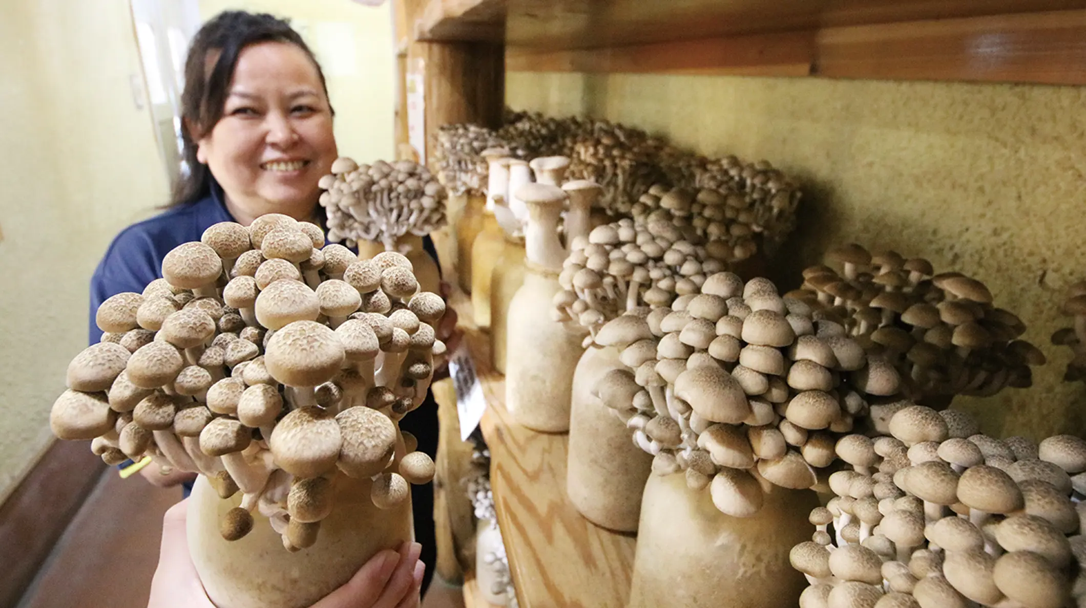 物産館「くるるん夢市場」には、アスパラガスやズッキーニなど地元の新鮮野菜や、エノキの天日干しといった加工品がズラリと並びます。芝生公園ではウサギがこどもたちに大人気。スイートコーンや黒枝豆など、季節に応じた農作物の収穫体験もあり、中でも10年ほど前から取り組んでいるキノコのもぎ取り体験が好評です。年間を通じてもぎ取り体験ができるように温度・湿度を一定に保った部屋があり、ブナシメジやエリンギなどをポットで育成しています。