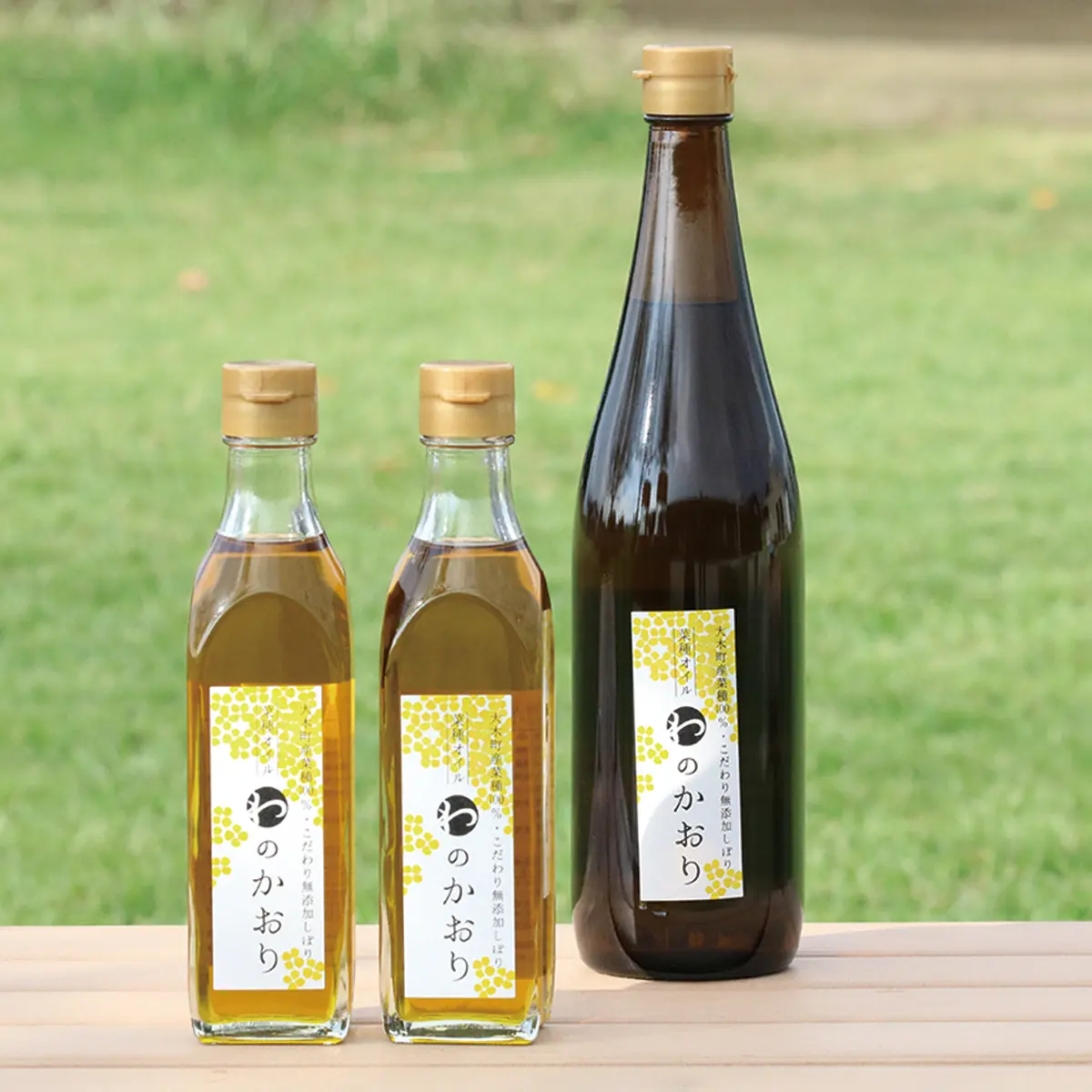 大木町産の菜種を昔ながらの製法で絞った『わのかおり』は、無添加にこだわった風味豊かな油です。天ぷらのほか、ドレッシングなどにもおすすめです。